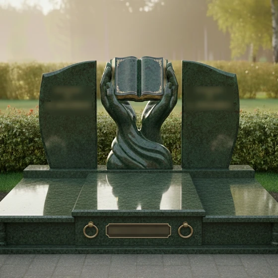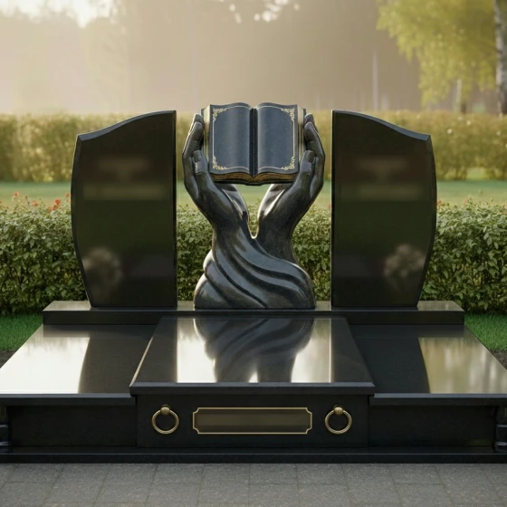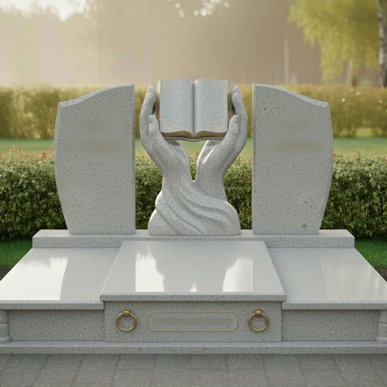 Каждая деталь этой модели пронизана глубокой философией. Руки символизируют бережную защиту, заботу и то, что душа усопшего находится в надежных объятиях вечности. Раскрытая книга — это классический символ прожитой жизни, «открытой главы» истории рода, мудрости и знаний, которые человек оставил после себя. Боковые плиты, обрамляющие центр, напоминают крылья или страницы, создавая ощущение завершенности и покоя. Отсутствие острых, агрессивных углов в верхней части памятника настраивает на смирение и умиротворение, подчеркивая светлый характер печали.