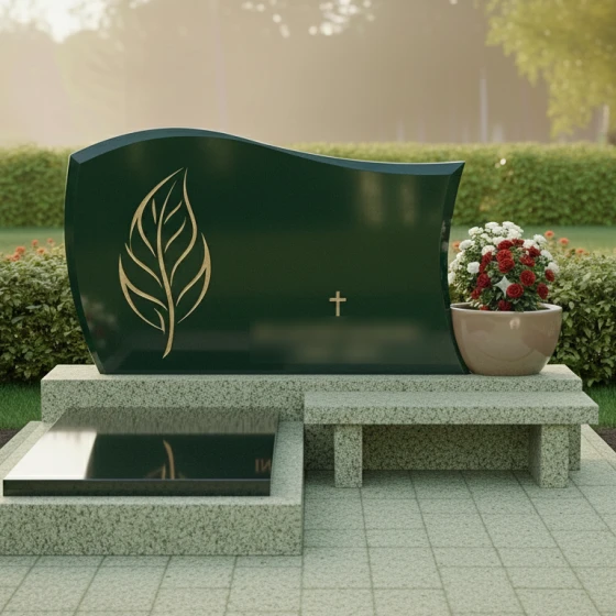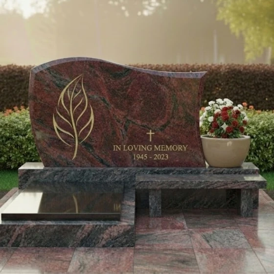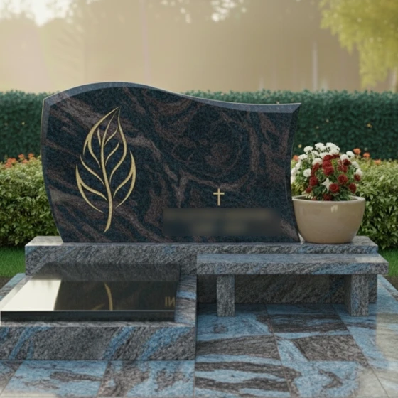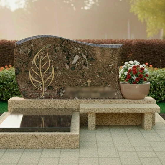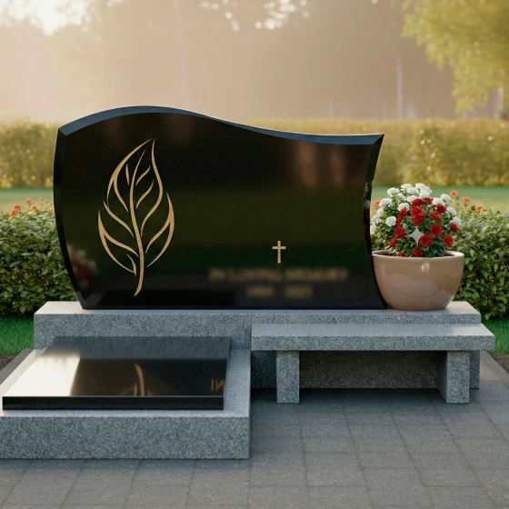 Модель мемориального комплекса под артикулом 705 — это результат кропотливой работы архитектора, стремящегося соединить монументальность природного материала с изяществом художественных линий. Главным акцентом композиции является асимметричная стела, верхняя грань которой выполнена в виде плавной, уходящей ввысь волны. Такая форма символизирует бесконечность жизненного цикла и покой. Левая часть монумента украшена глубокой художественной резьбой в виде стилизованного золоченого листа. Тонкая проработка каждой прожилки и мягкие изгибы резного элемента создают выразительный контраст с идеально гладкой, зеркально отполированной поверхностью основного камня. В центральной части стелы расположен лаконичный православный крест, выполненный в едином стиле с растительным орнаментом, что придает надгробию строгость и духовную завершенность.