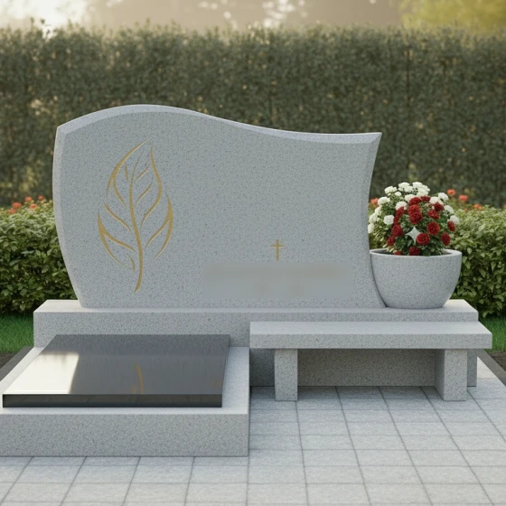 Данный ансамбль представляет собой законченное решение по обустройству места захоронения. Надгробие из натурального камня установлено на сложный двухъярусный цоколь, который обеспечивает конструкции максимальную устойчивость и защиту от проседания грунта. Особого внимания заслуживает функциональное зонирование: левая часть участка закрыта массивной полированной плитой, которая подчеркивает монолитность сооружения и значительно упрощает уход за территорией. С правой стороны в основание интегрирована гранитная скамья — важный элемент мемориальной архитектуры, создающий условия для уединенного поминовения. Композицию завершает изящная каменная ваза (чаша), установленная на постаменте, которая позволяет органично дополнить строгий вид камня живыми цветами.