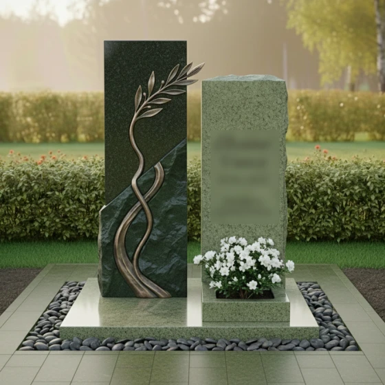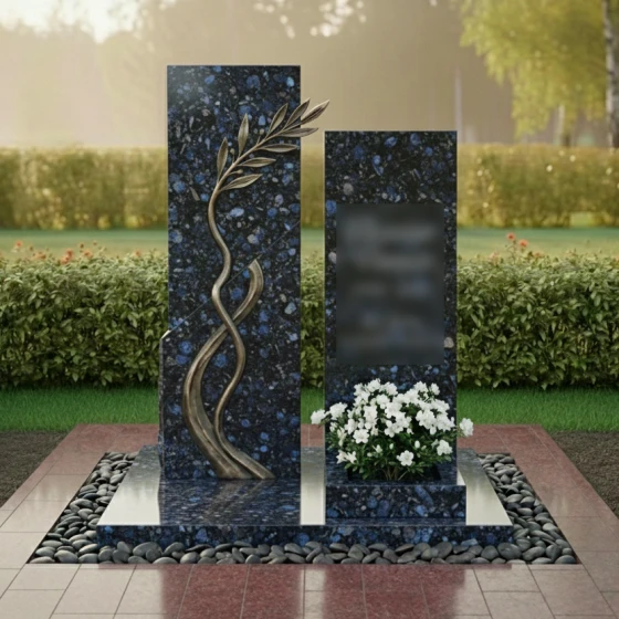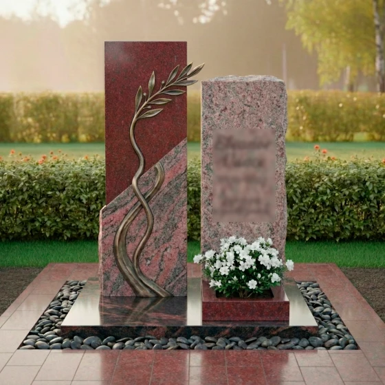 Данная модель представляет собой сложную архитектурную композицию, состоящую из двух вертикальных элементов, гармонично дополняющих друг друга. Левая часть памятника приковывает взгляд необычной игрой фактур: идеально ровная, зеркально отполированная поверхность встречается с диагональным срезом «скальной» фактуры. По этому необработанному, дикому камню изящно вьется объемная бронзовая ветвь с детально проработанными листьями. Каждая прожилка на листе, каждый изгиб стебля выполнены с ювелирной точностью, создавая эффект живого растения, застывшего в вечности. Правый элемент мемориала выполнен в более сдержанном стиле, имея строгую прямоугольную форму, которую венчает «колотая» верхушка, имитирующая естественный разлом горной породы. Такое сочетание безупречной полировки и грубого камня создает неповторимый визуальный контраст, подчеркивающий монументальность изделия.
