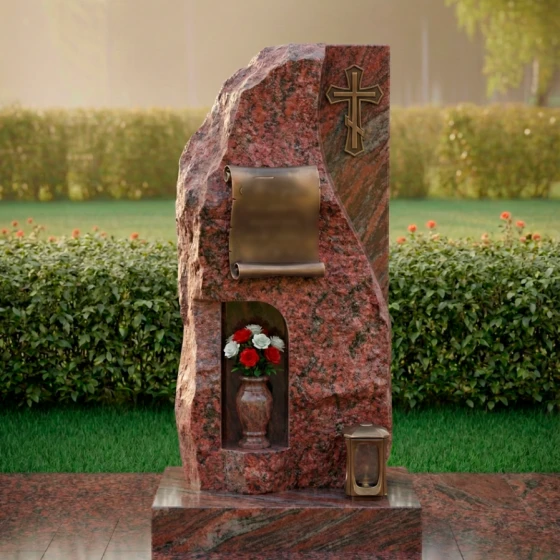 Особого внимания заслуживает художественная интеграция функциональных элементов. В центре композиции расположена накладная панель в форме старинного свитка. Изгибы «бумаги», застывшие в металле, создают объемную доминанту, на которой информация об ушедшем человеке будет выглядеть как страница истории, запечатленная в вечности. В нижней части вертикального блока вырезана глубокая арочная ниша — уникальное конструктивное решение, позволяющее интегрировать вазу с цветами непосредственно в тело камня. Это не только защищает аксессуар, но и создает эффект «живого» памятника, где природа и архитектура сливаются воедино. Массивная подставка служит надежным фундаментом, на котором симметрично расположен декоративный светильник (лампада), завершающий ансамбль и придающий ему монументальную устойчивость.
