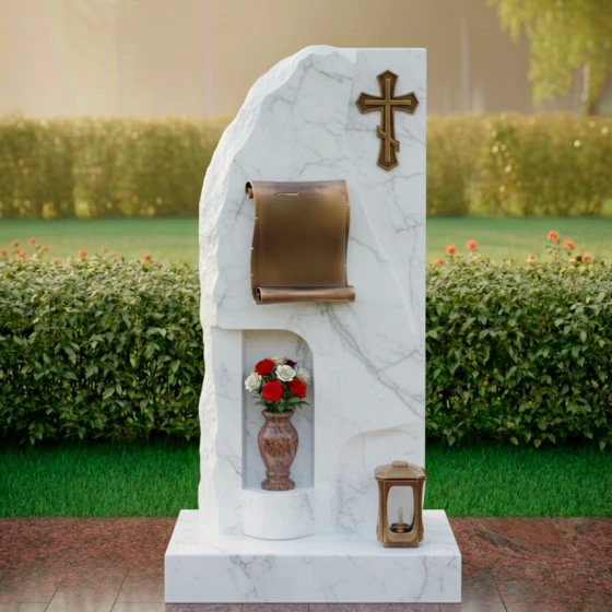 Кому подойдет: Данная модель является универсальным решением для тех, кто ищет сочетание традиционных религиозных символов и современного дизайна. Благодаря возможности выбора цвета и фактуры, памятник одинаково гармонично подчеркнет мужскую силу (в темном граните) или женскую утонченность (в светлых тонах или мраморе). Это выбор для людей, ценящих долговечность, уникальную ручную работу и эстетику «дикого» камня, интегрированного в строгие архитектурные формы.
