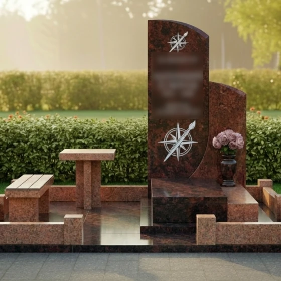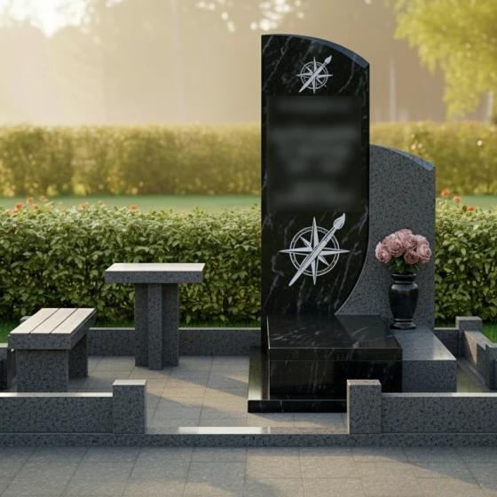 Представленное надгробие из натурального камня (модель 714) — это не просто памятный знак, а гармоничный архитектурный ансамбль, выполненный в современном европейском стиле. Композиция поражает своей лаконичностью и глубоким символизмом. Центральным элементом является вертикальная стела асимметричной формы: левая грань сохраняет строгую вертикаль, в то время как правая плавно уходит в изящный дугообразный изгиб. Эта мягкая волна придает массивному камню визуальную легкость и одухотворенность. Зеркальная полировка основной поверхности создает глубокий блеск, в котором отражается вечность, контрастируя с тонкой художественной гравировкой. На стеле дважды запечатлен уникальный символ — стилизованная роза ветров, совмещенная с кистью художника. Эти детали, выполненные с ювелирной точностью, подчеркивают творческую натуру и многогранность личности ушедшего человека, его стремление к поиску своего пути и созиданию.