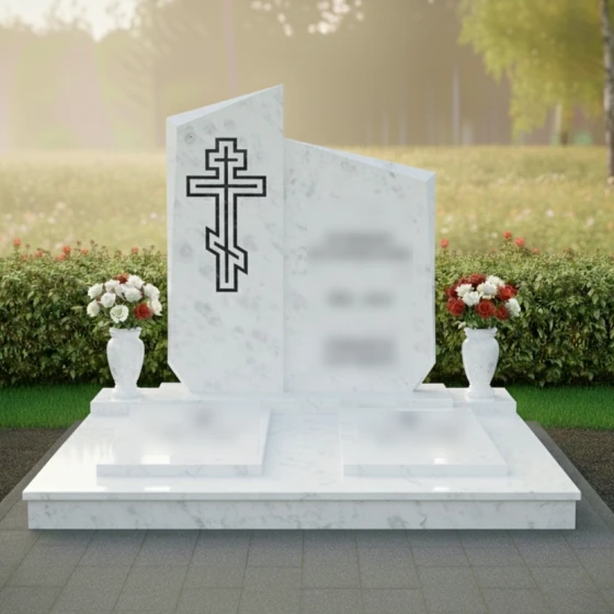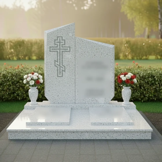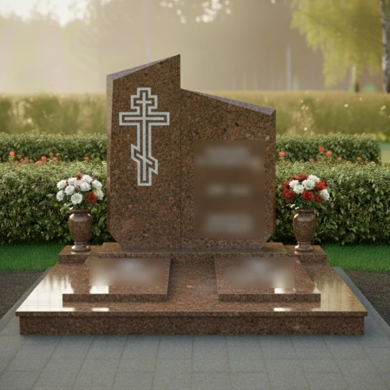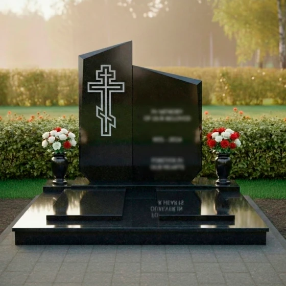Центральным элементом композиции является величественная стела, состоящая из двух вертикальных сегментов разной высоты, объединенных в единый ансамбль. Верхняя грань мемориала имеет сложную асимметричную геометрию: резкие, динамичные скосы устремлены ввысь, что создает визуальный эффект восхождения. Грани стелы обработаны широкой фаской, которая подчеркивает массивность натурального камня и придает объекту дополнительный объем. Особое внимание уделено художественному оформлению: на левой, более высокой части плиты, вырезан православный крест. Его исполнение отличается лаконичностью — четкий двойной контур подчеркивает строгость веры, не перегружая композицию лишними деталями. Зеркальная полировка основной поверхности контрастирует с матовым внутренним срезом креста, создавая благородную игру света и тени, заметную при любом ракурсе.