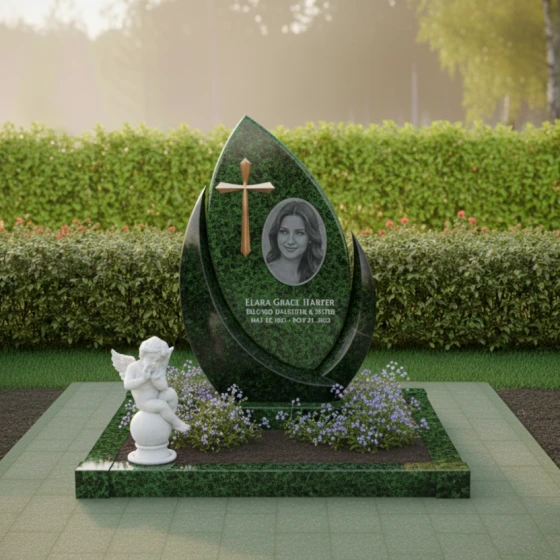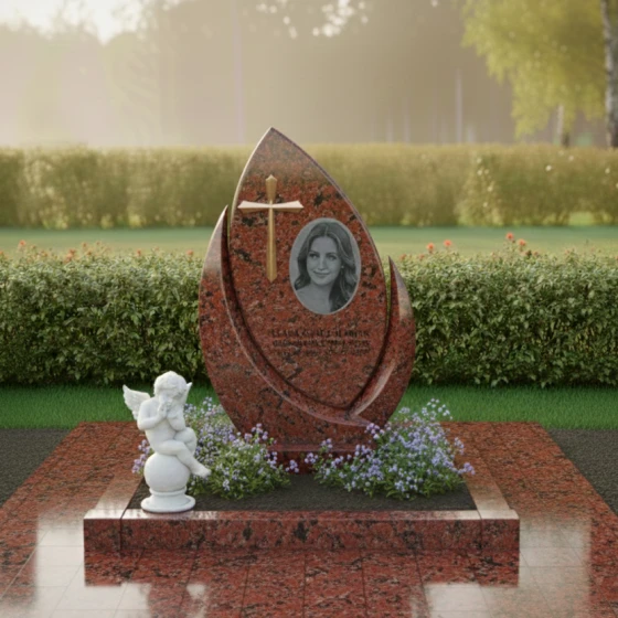 Данная художественная композиция представляет собой истинное воплощение природной грации и тихой скорби, застывшей в камне. В основе дизайна лежит изящная асимметрия: гранитный монумент выполнен в виде раскрывающегося лепестка или застывшего языка пламени, который словно оберегает память об ушедшем человеке. Основной смысловой акцент сделан на двухсоставной конструкции — внутренний темный элемент, несущий на себе основные символы и портрет, мягко вложен в светлую внешнюю «колыбель» из контрастного камня. Такая многослойность придает изделию объем и визуальную глубину, выделяя его на фоне типовых решений.