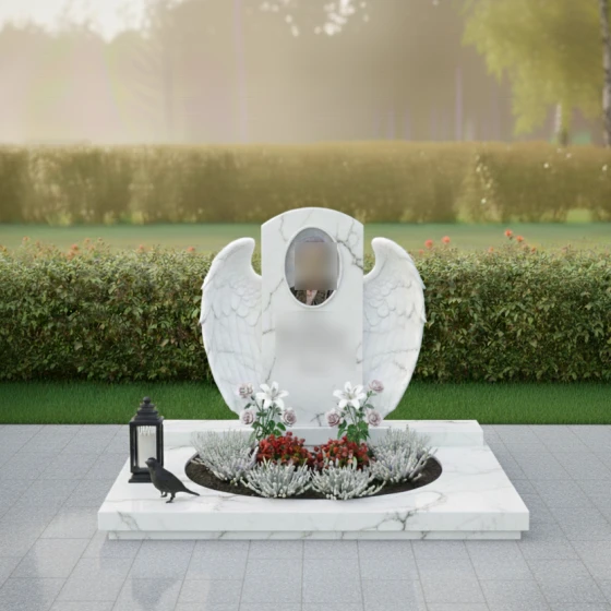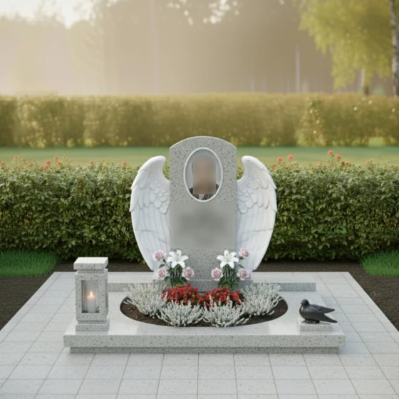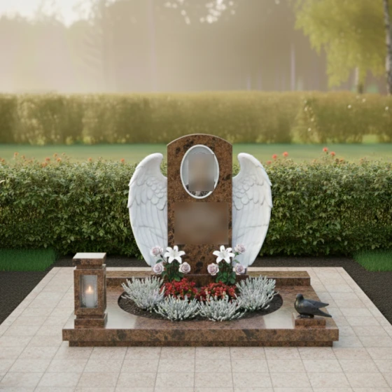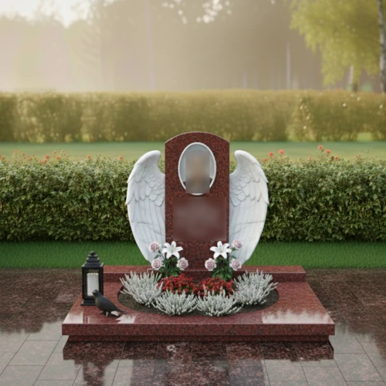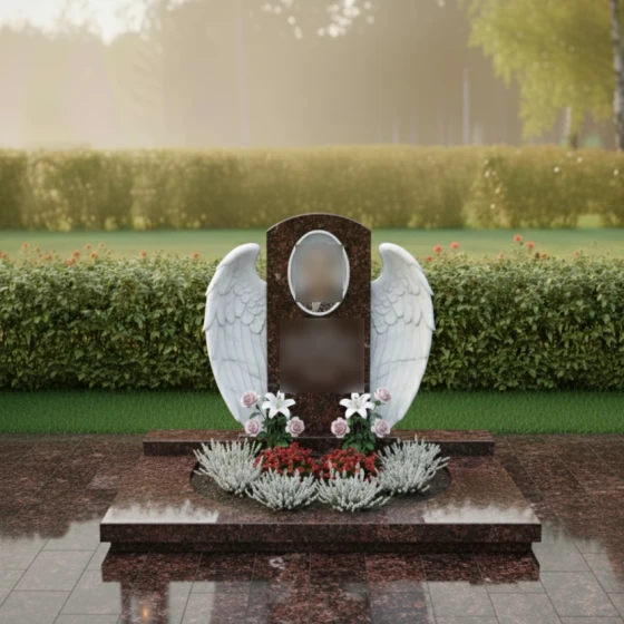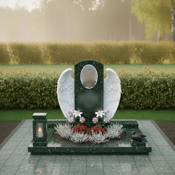 Кому подойдет: Данная модель создана для тех, кто хочет выразить безграничную нежность и любовь. Благодаря наличию ангельской символики, цветов и плавных линий, композиция чаще всего выбирается для оформления женских захоронений — для мамы, жены, дочери или сестры. Она подчеркивает женственность, доброту и ту светлую печаль, которую хранят в сердцах близкие. Однако в строгом исполнении из темного камня (например, Габбро-диабаза) этот мемориальный комплекс может стать достойным символом вечной памяти и для мужчины, если его жизнь была наполнена созиданием и заботой о семье.