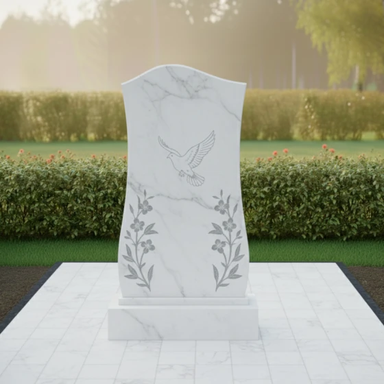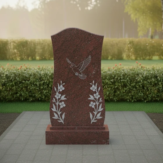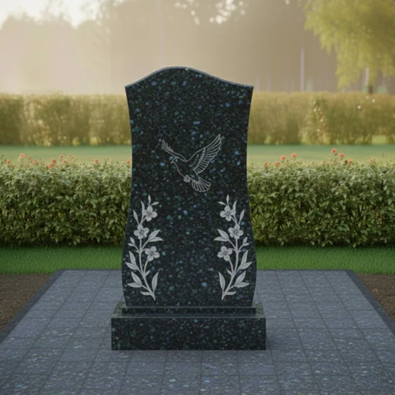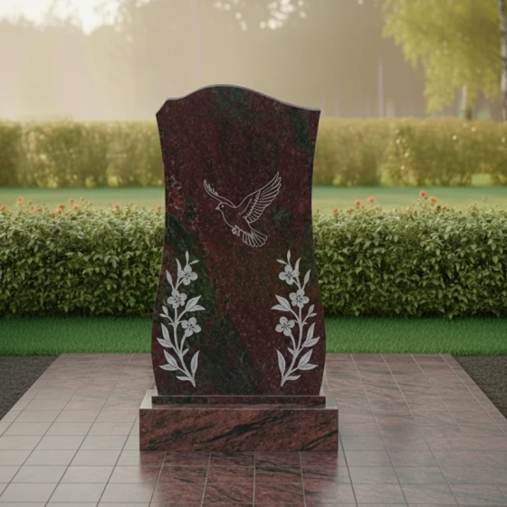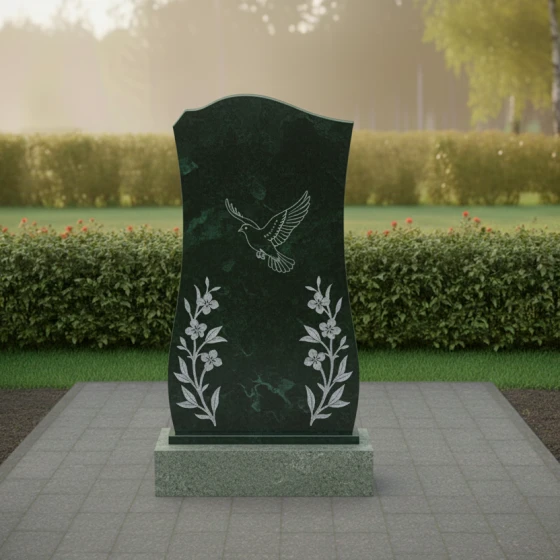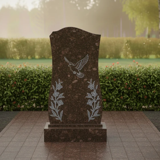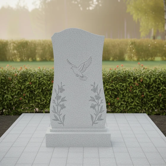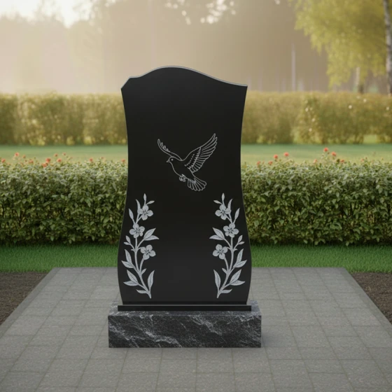 Центральное место в оформлении занимает символическая резьба, нанесенная методом высокоточной гравировки. В верхней части стелы изображен парящий голубь — вечный символ чистоты, мира и освобожденной души, стремящейся к небесному свету. В нижней части композиции, словно поддерживая память, расположены две симметричные ветви с распускающимися цветами. Детализация лепестков и листьев выполнена с ювелирным изяществом: игра матовой фактуры на фоне черной или цветной зеркальной поверхности создает эффект объема. Эти цветы символизируют вечное цветение жизни в памяти близких и ту нежность, которую невозможно выразить словами, но можно запечатлеть в граните.