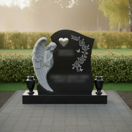 Центральное место в композиции занимает вертикальная стела со сложной комбинированной резьбой. Левая грань монумента представляет собой высокохудожественный барельеф скорбящего ангела. Мастерски исполненная фигура небесного покровителя склонена в смиренной молитве, а его крылья, детально проработанные в камне, словно обнимают плиту, создавая атмосферу защиты. Резьба выполнена с особым вниманием к деталям: каждое перо крыла имеет выраженный объем и фактуру, что создает эффектный контраст с идеально гладкой, зеркальной поверхностью основной части камня.