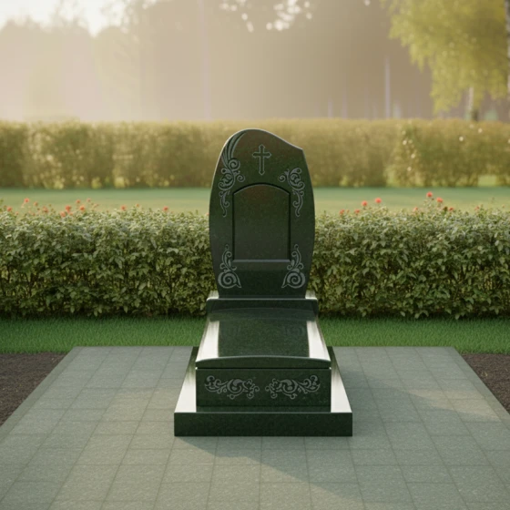 Особое внимание притягивает художественная резьба, обрамляющая пространство для портрета. Изящные растительные орнаменты в виде симметричных завитков создают эффектную рамку, которая словно «раскрывает» стелу навстречу зрителю. Надгробие из натурального камня в этой модели демонстрирует безупречную игру контрастов: идеально черная зеркальная полировка основной плоскости соседствует со светлым матовым срезом камня внутри резных элементов. Это создает глубокий объемный эффект, который меняется в зависимости от угла зрения, заставляя композицию «оживать» при движении света.