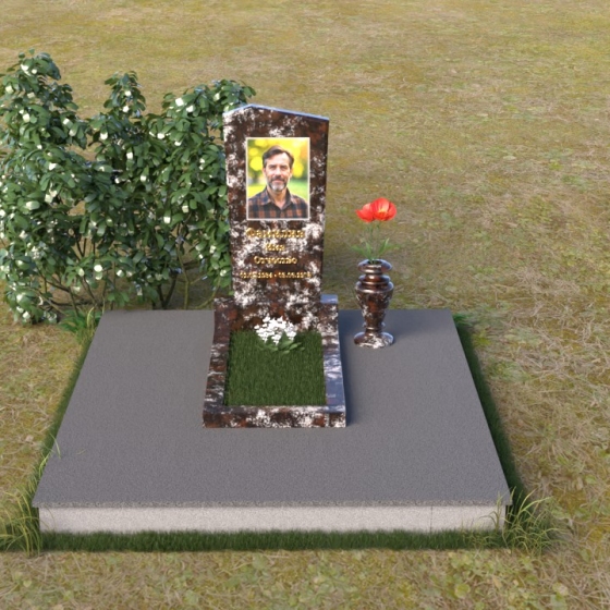 Этот гранитный монумент представляет собой композицию из двух основных элементов: вертикальной плиты с портретом и горизонтальной накладки. Вертикальная плита, возвышающаяся над землей, имеет строгую прямоугольную форму с небольшим скосом в верхней части. Это придает монументу сдержанную элегантность. Зеркальная полировка поверхности отражает свет, создавая ощущение глубины и сияния. На плите выгравирован портрет усопшего, выполненный с высокой точностью и вниманием к деталям. Ниже портрета располагается надпись с именем и датами жизни, выполненная золотым шрифтом. Горизонтальная накладка, расположенная в нижней части, также выполнена из черного полированного гранита и служит своеобразным пьедесталом для вертикальной плиты. Ее гладкая поверхность создает дополнительный контраст с окружающей средой. Рядом с монументом установлена ваза из черного гранита, предназначенная для живых цветов.