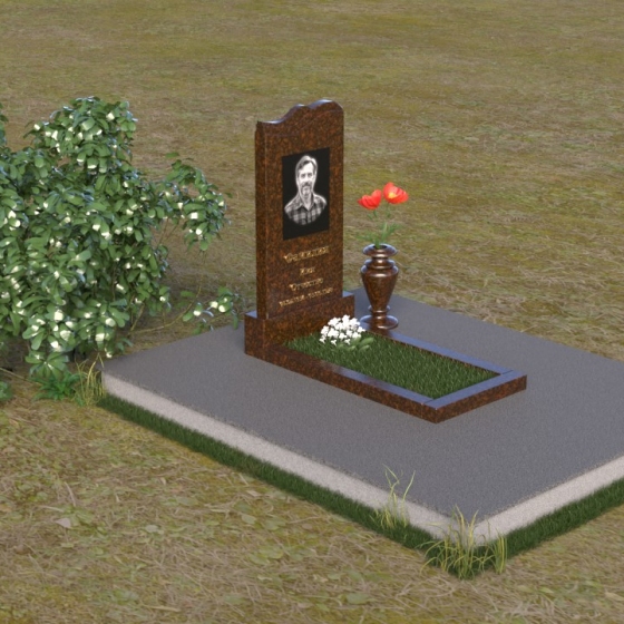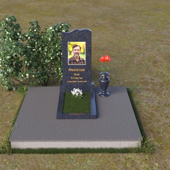 Этот гранитный монумент представляет собой вертикальную плиту с плавной, волнообразной линией верха, словно застывшая морская волна, несущая в себе покой и умиротворение. Боковые грани надгробного сооружения мягко скруглены, что придает ему изящный и завершенный вид. Верхняя часть памятника, обрамляющая портрет усопшего и памятную надпись, выполнена в строгом прямоугольном стиле, подчеркивая лаконичность и сдержанность дизайна. Нижняя часть памятника переходит в горизонтальную плиту, создавая единую композицию, гармонично вписывающуюся в окружающий ландшафт. Фаски по периметру обеих плит аккуратно сняты, что придает изделию дополнительную элегантность и законченность.